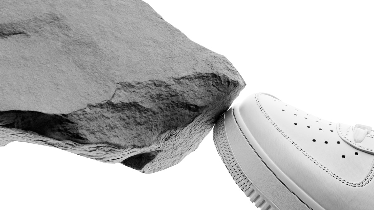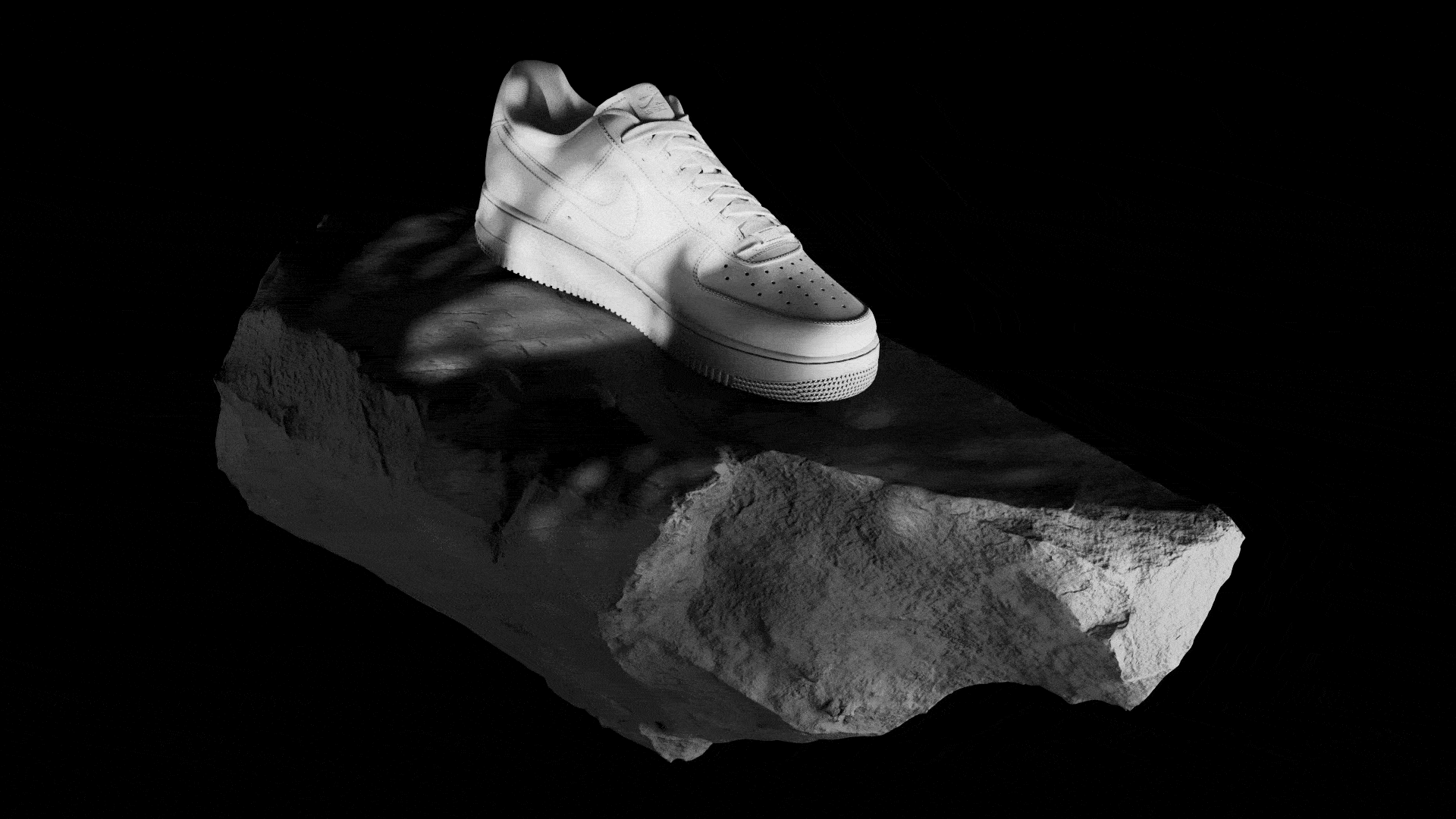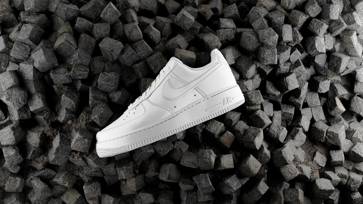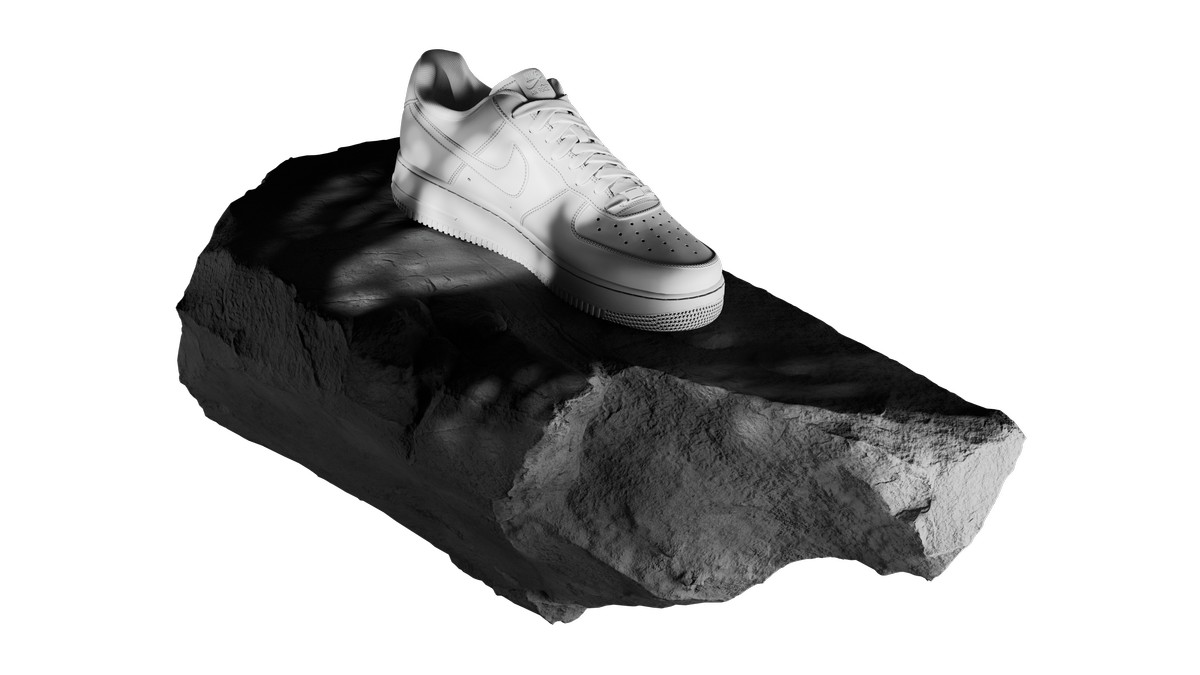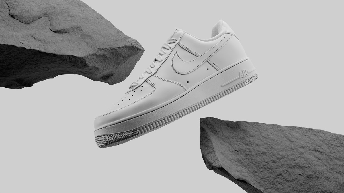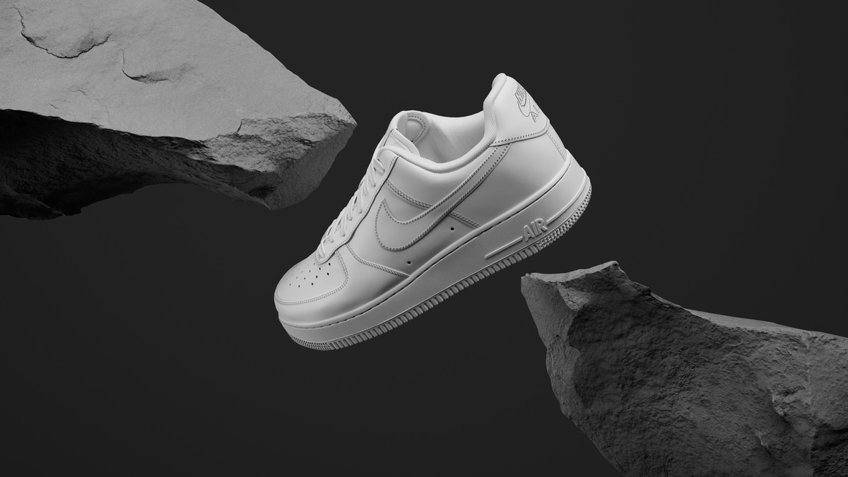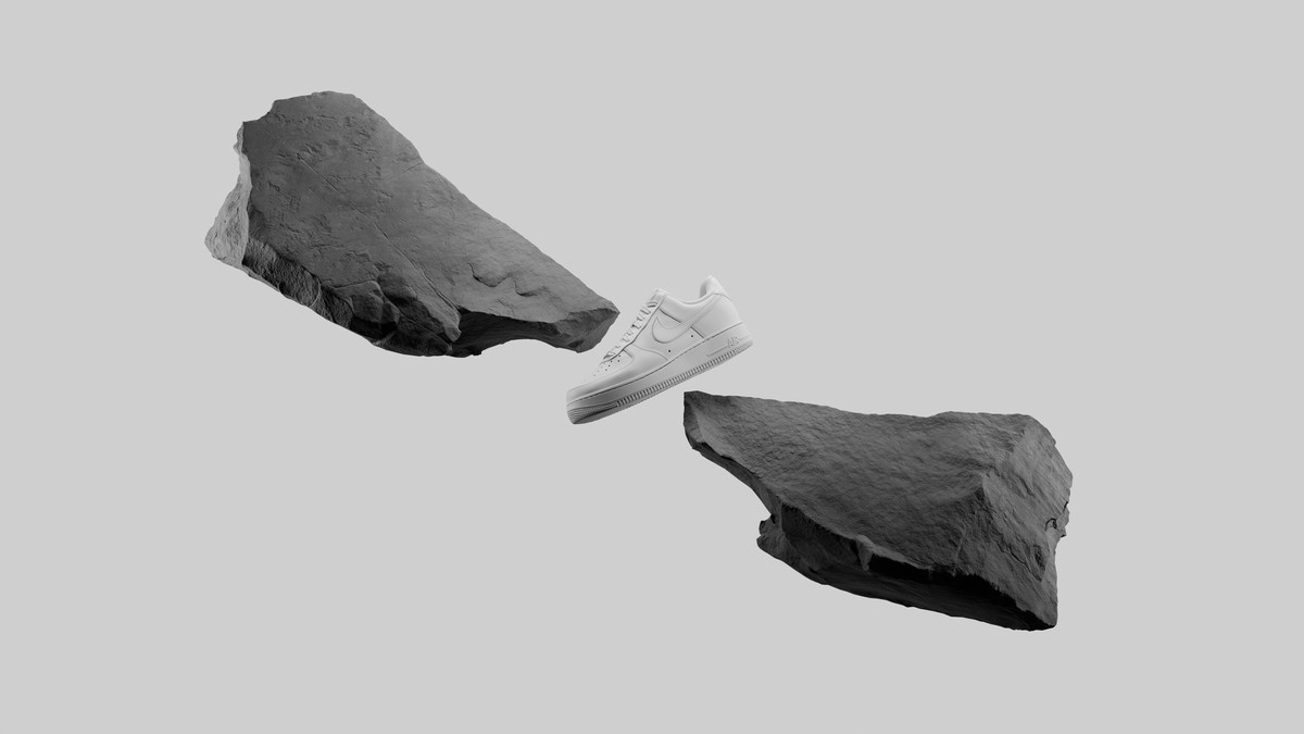 The Nike Air Force floats magically among the rocks